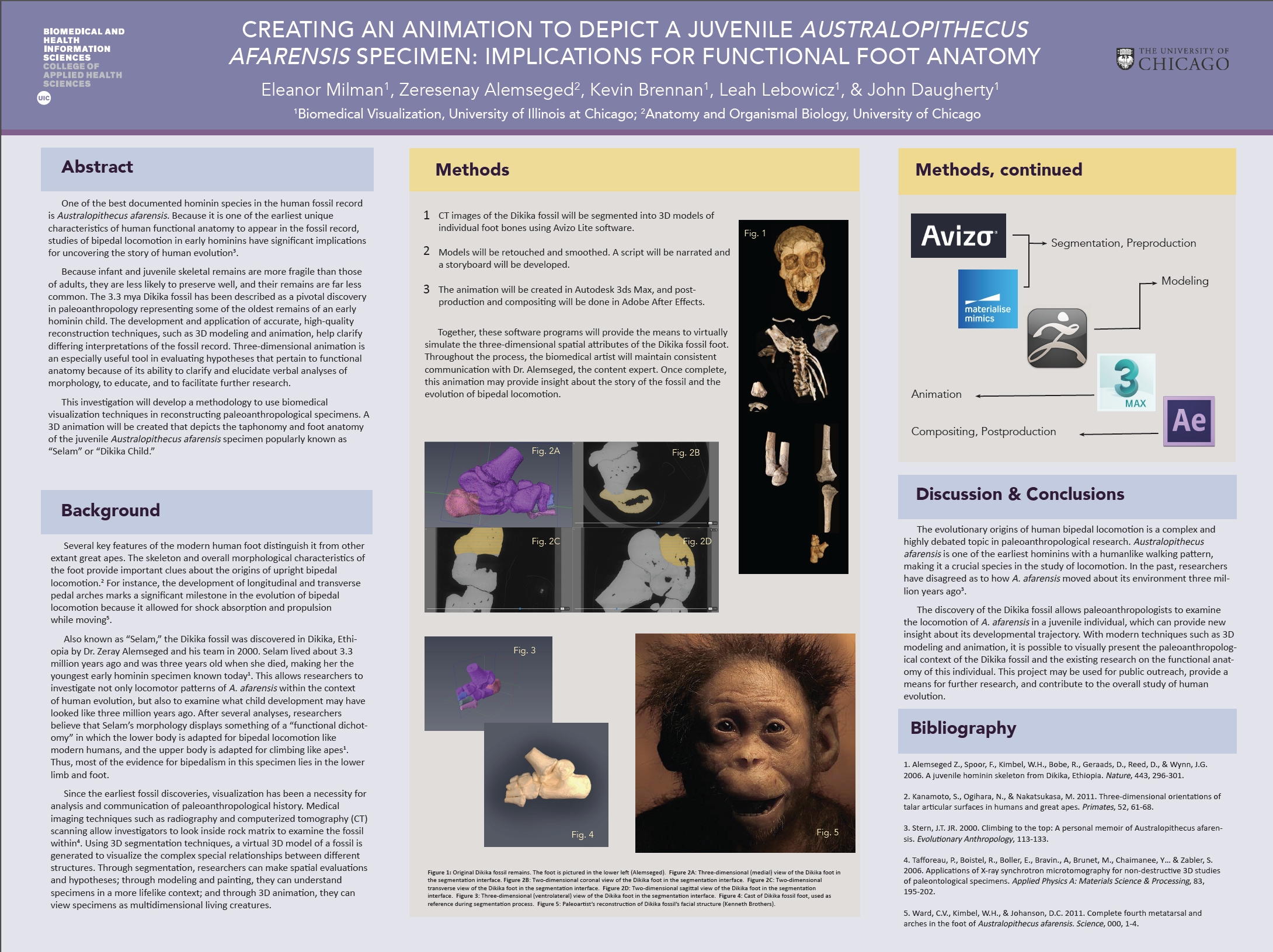 This research project developed a methodology to use biomedical visualization techniques in reconstructing fossil specimens of human ancestry. A 3D animation was created that depicts the story and foot anatomy of the juvenile Australopithecus afarensis specimen popularly known as “Selam” or “The Dikika Child.” This visualization may help researchers observe subtle features that characterize the history of human locomotion. Learn more about the project by reading the article in the Journal of Biocommunications.